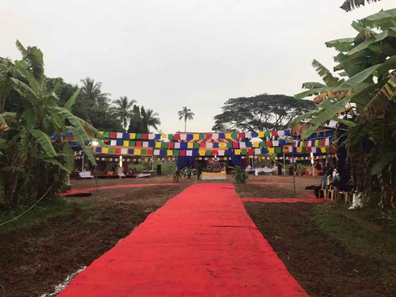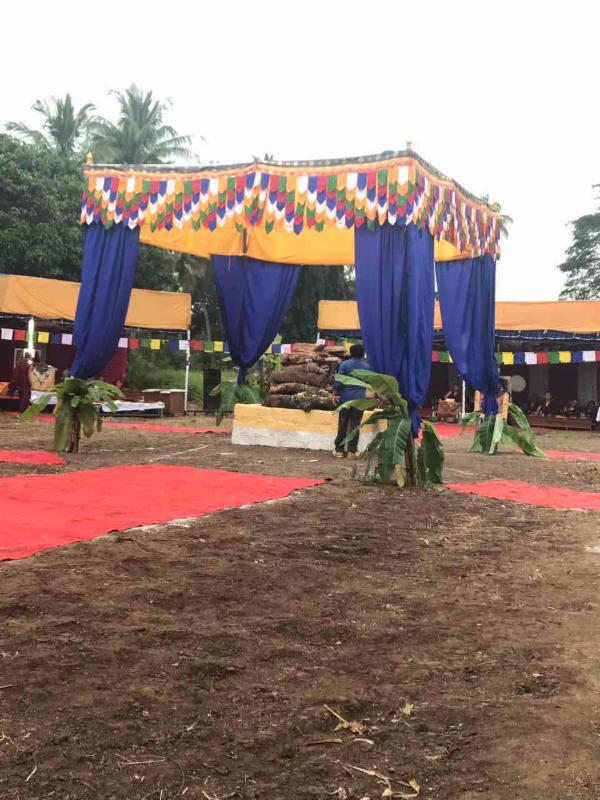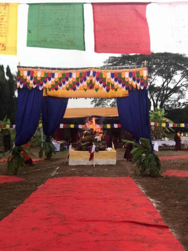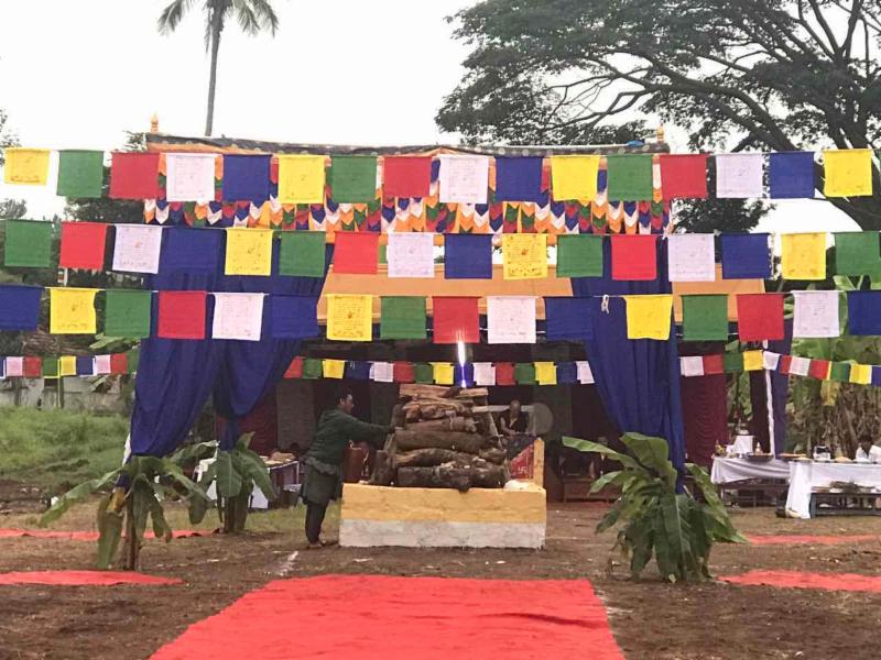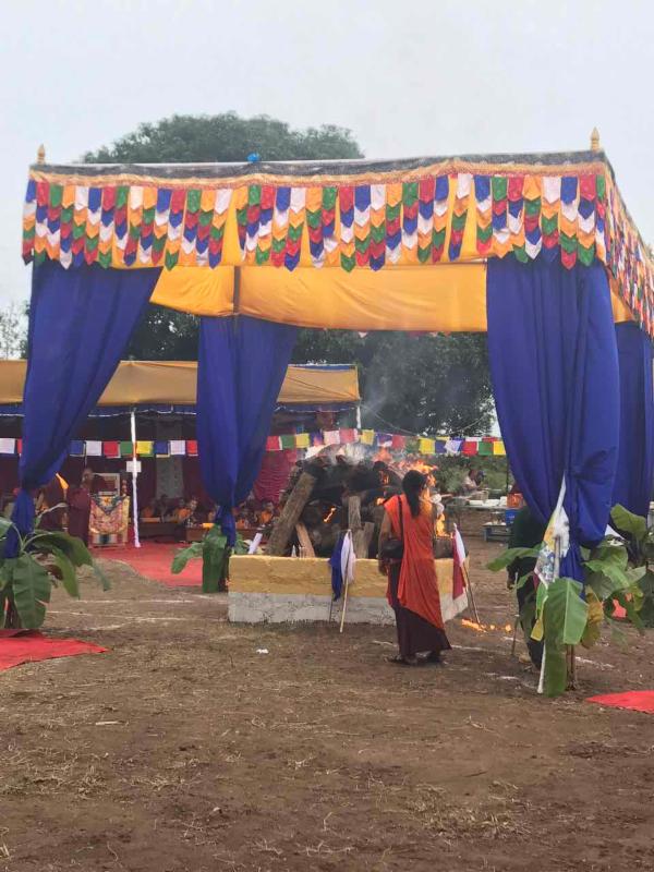 A Jinsek (fire offering) cremation ceremony for Ogyen Lhamo was performed yesterday in Bylakuppe, South India, by five different monasteries: Namdroling, presided by Lama Sonam Gyamtso; Drukpa Kagyu, presided by Khenpo Nyedon; Karma Kagyu, presided by Terton Samten Lingpa; Sakya, presided by Lama Kunga Lobsang; and Drikung Kagyu, presided by Ayang Rinpoche.